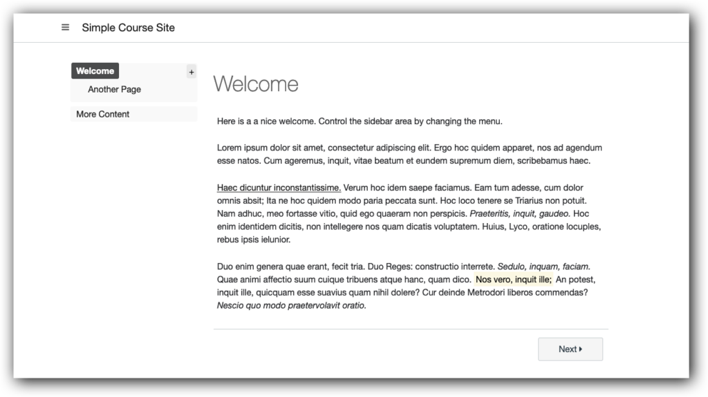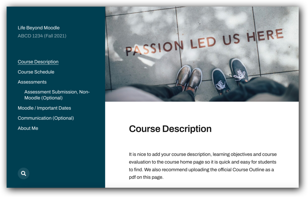 Based on the OpenEd Canvas Clone theme, this template features a left side menu, customizable sections and navigational buttons. This template works well for large or small course when you want to keep the visual aesthetics simple and clean.