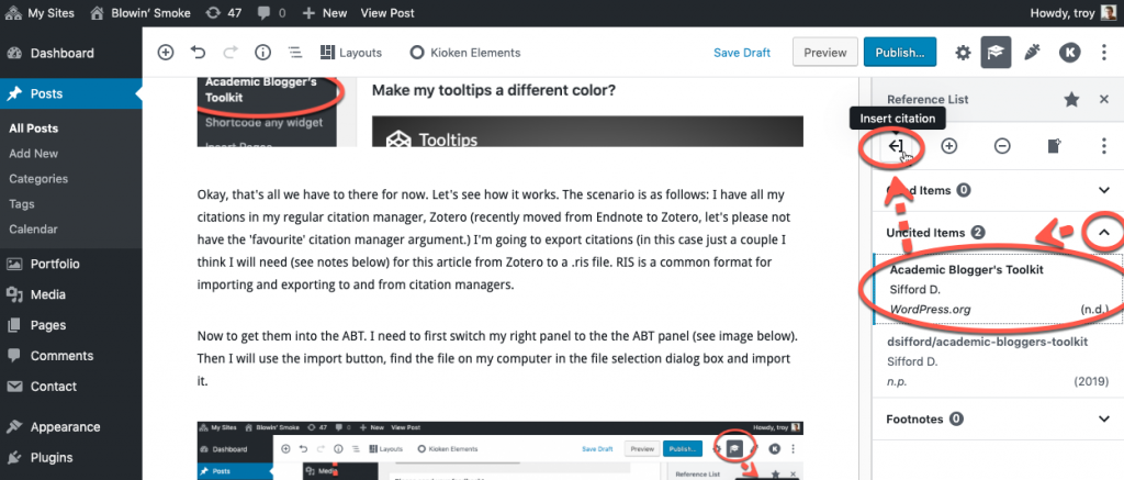 We now have our references in the ABT panel. We have not cited anything, so they all appear in the “Uncited Items” area. Let’s put in a citation and see how that works. I’ll put the citation for the Academic Blogger’s Toolkit plugin webpage on wordpress.org right here. (D. P. Sifford 2019) What I did was position my cursor in my text where I wanted the citation, open the “Uncited Items” panel, selected my citation (I could have selected more than 1 using the shift or control key as I was selecting them), and then clicked the “Insert citation” button as seen in the image below.