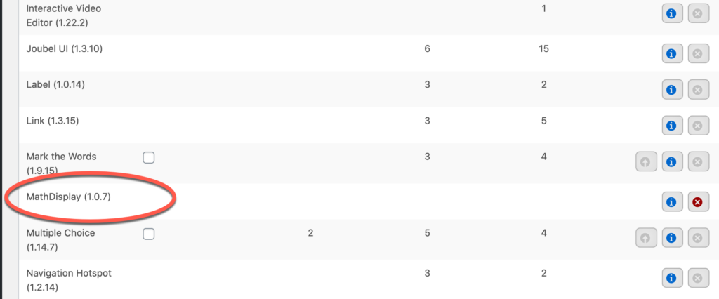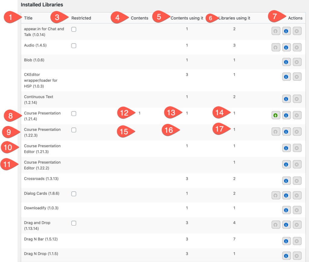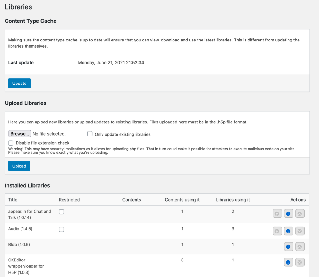 Now for some good news. Usually you just need to tend to the version of the Content Types you are actually using in authoring and the Content Type will handle the updates of its dependencies. The exception is when you have manually uploaded a library or a content type that is not one of H5P’s stock ones. We’ll look at a manual library addition further down.