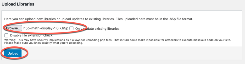 On our way to fixing errors let’s look at uploading a library. This came up about a week or two ago. It seems that there is a library that, when uploaded, will allow you to include mathematical expressions via the latex language in H5P text fields. https://h5p.org/mathematical-expressions. All we need to do is download the library and then upload it to our site using the library manual upload interface.